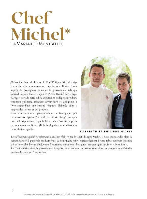 Nichée au cœur de la Bourgogne, entre Tournus et Mâcon, La Marande est une adresse incontournable pour les amateurs de gastronomie. Depuis 2001, le chef Philippe Michel et son épouse Elisabeth y accueillent les convives dans une élégante demeure bourgeoise en pierres de Bourgogne, entourée d’un vaste jardin paysager. Ce cadre enchanteur est le théâtre d’une cuisine raffinée, récompensée par une étoile au Guide Michelin en 2014.