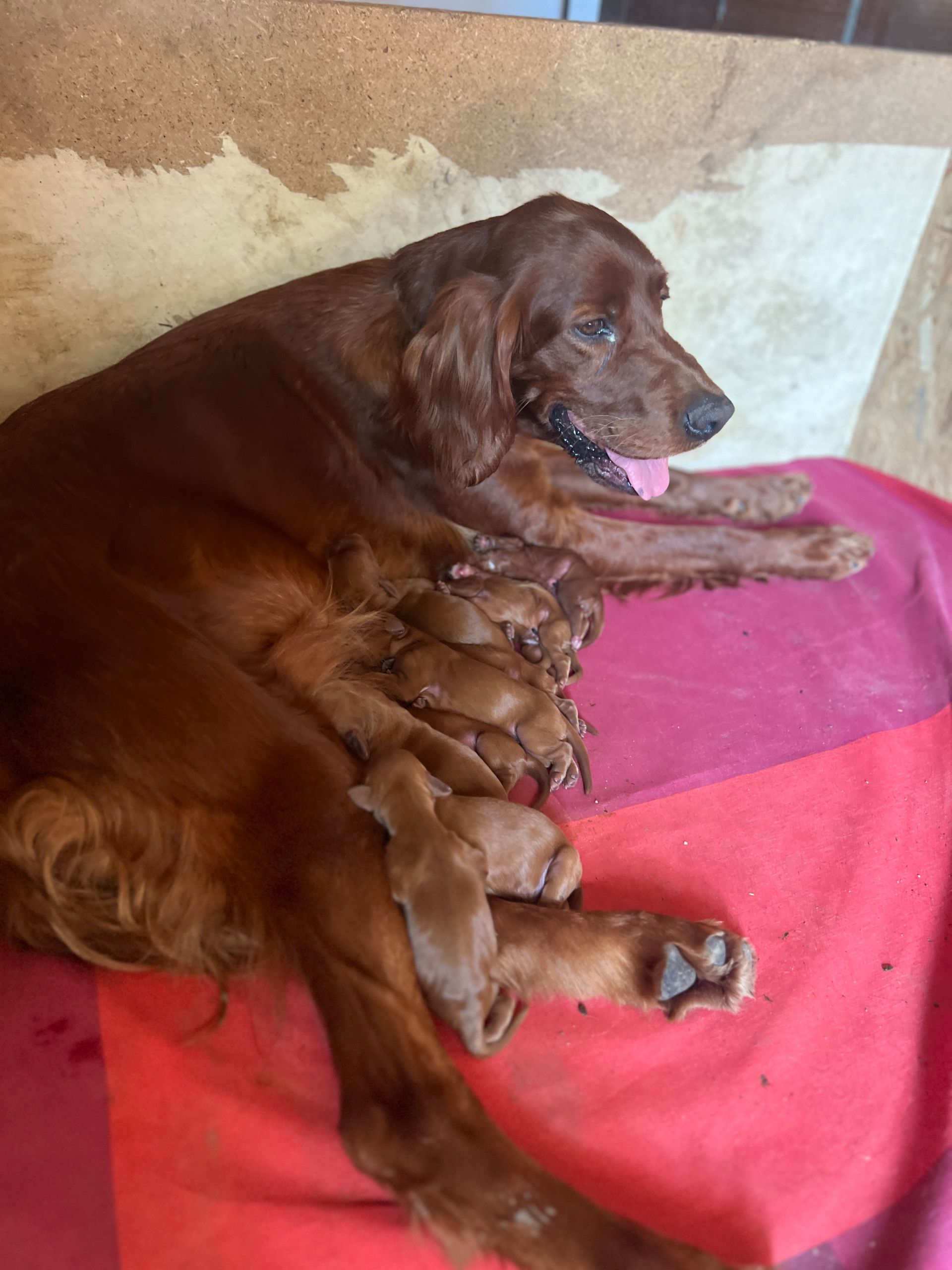 Chiots Setter Irlandais Nés le 14/07/2025, 10 chiots : 3 mâles, 7 femelles, LOF, à réserver, disponibles fin Septembre. Haute lignée issue de Champions. Père et Mère Trialers, Bécasses, Gibier Naturel. Mère gagnante (Numéro d’identification 250269590309476)Finale des jeunes et Prix du Style 2025 Père et Mère : RCACS en Nationale d'Expo Chiens pour chasse et Field trial