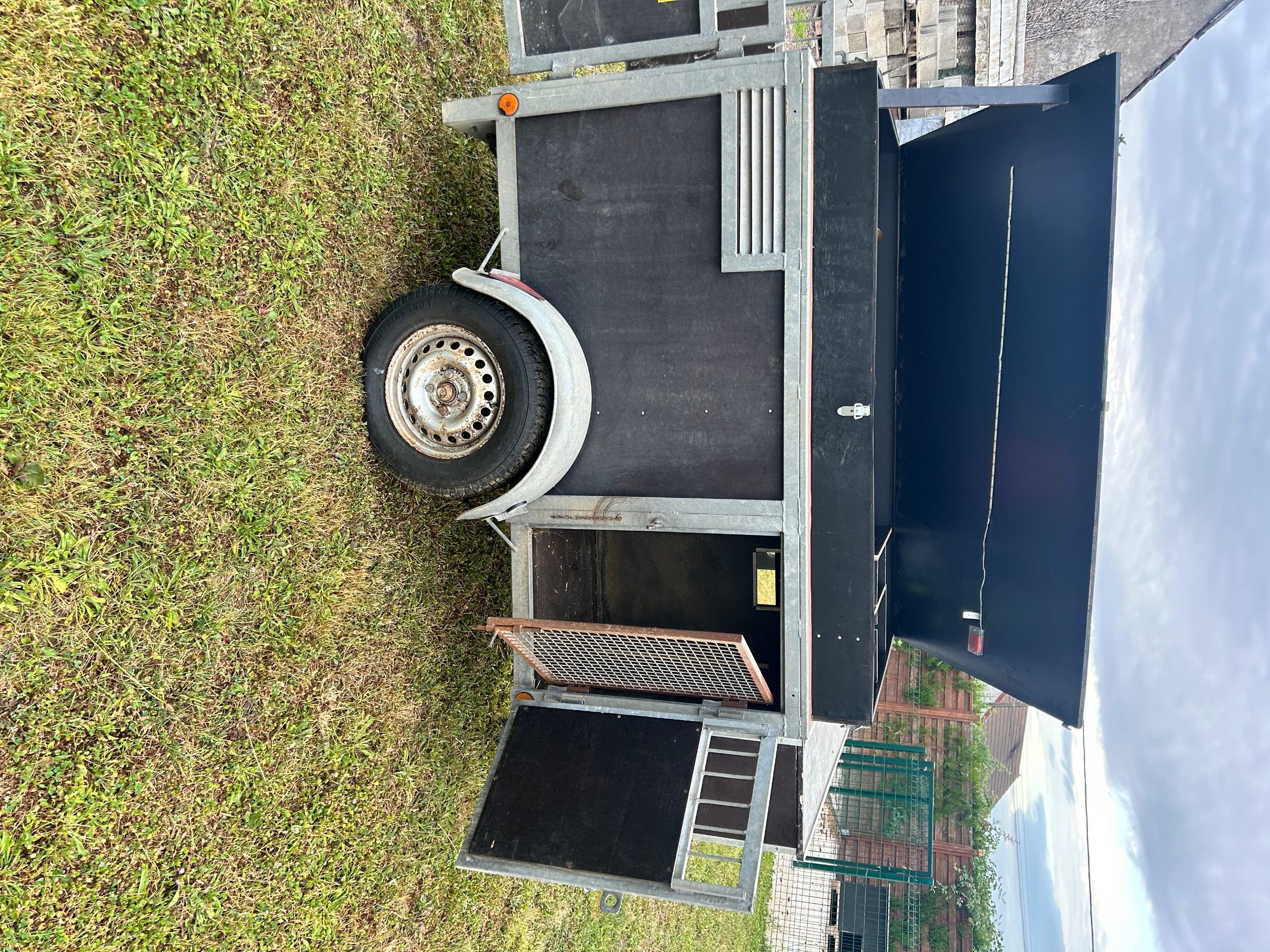 Remorque à chien 4 places d’environ 80cmx50cm avec coffre à l’avant et coffre sur le dessus. Tout les feux fonctionnent. Roue de secours. Aucune rouille. Pneu usure à 40%.