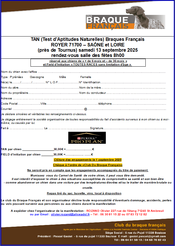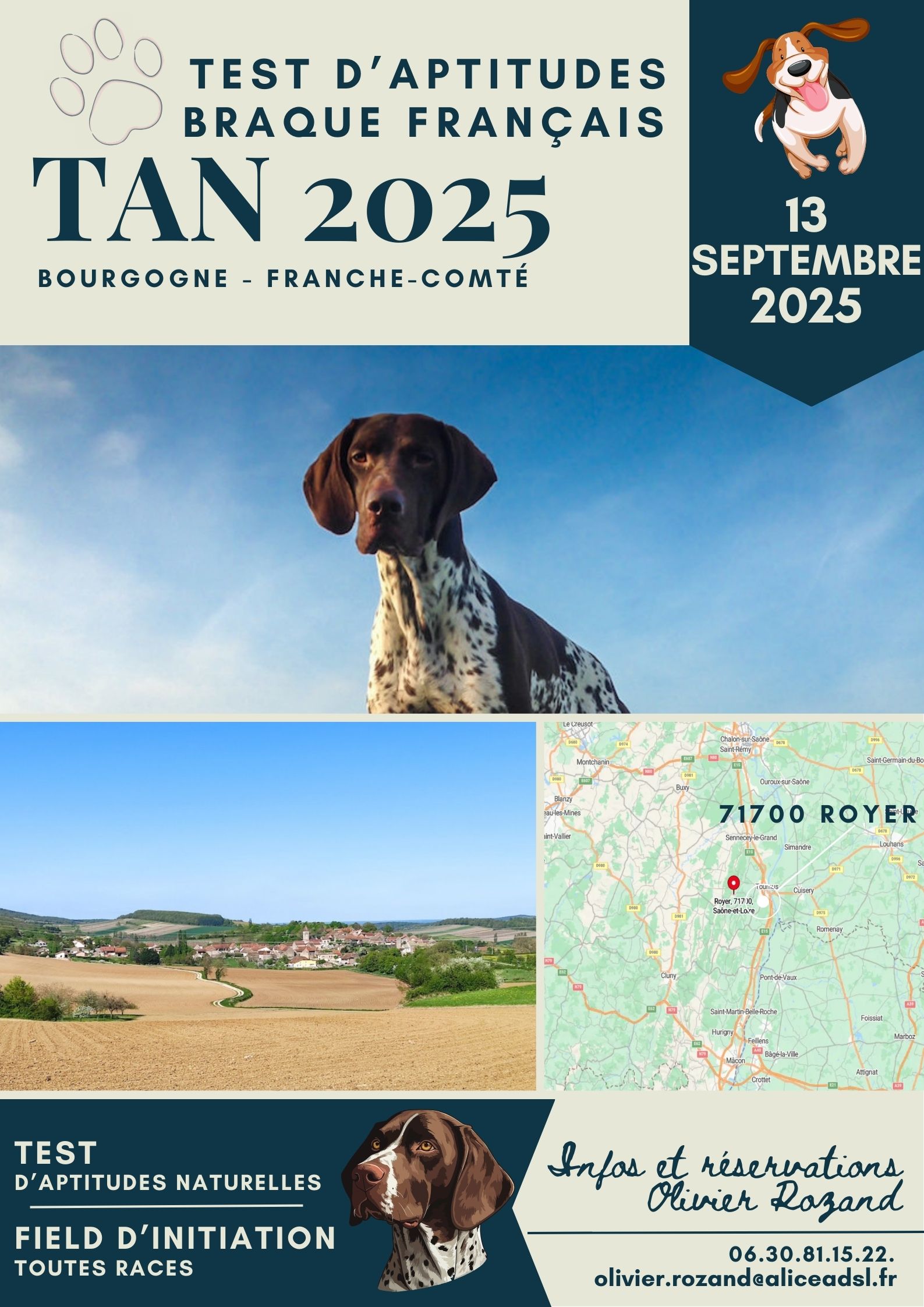 Un TAN (Test d'Aptitudes Naturels) pour BRAQUES FRANCAIS TYPE PYRENEES et GASCOGNE inscrits au LOF agés de 6 à 36 mois, est organisé par le club du braque français à Royer (71700 Tournus) le 13 SEPTEMBRE 2025. Pour les Néophytes, ce n'est pas une compétition, mais un examen officiel pour évaluer les qualités naturelles de votre jeune auxiliaire et obtenir par la même occasion une cotati...