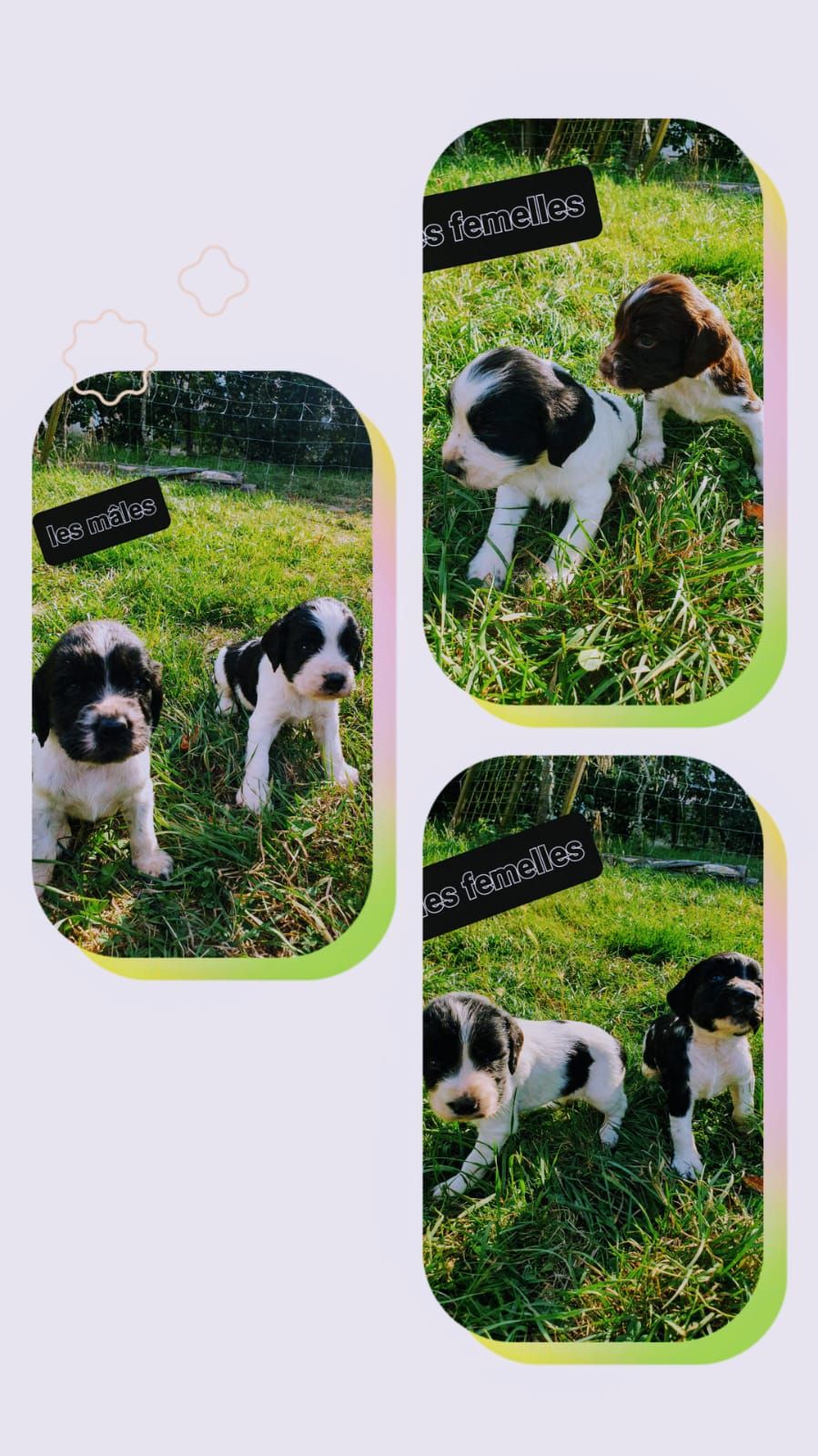 A RESERVER CHIOTS SPRINGER (non LOF) - Portée : 4 M - 4 F Origine chasse petit et grand gibier - Pucés et vaccinés Disponibles à partir du 7 octobre RENSEIGNEMENTS PAR TELEPHONE UNIQUEMENT AU 06 87 36 80 03