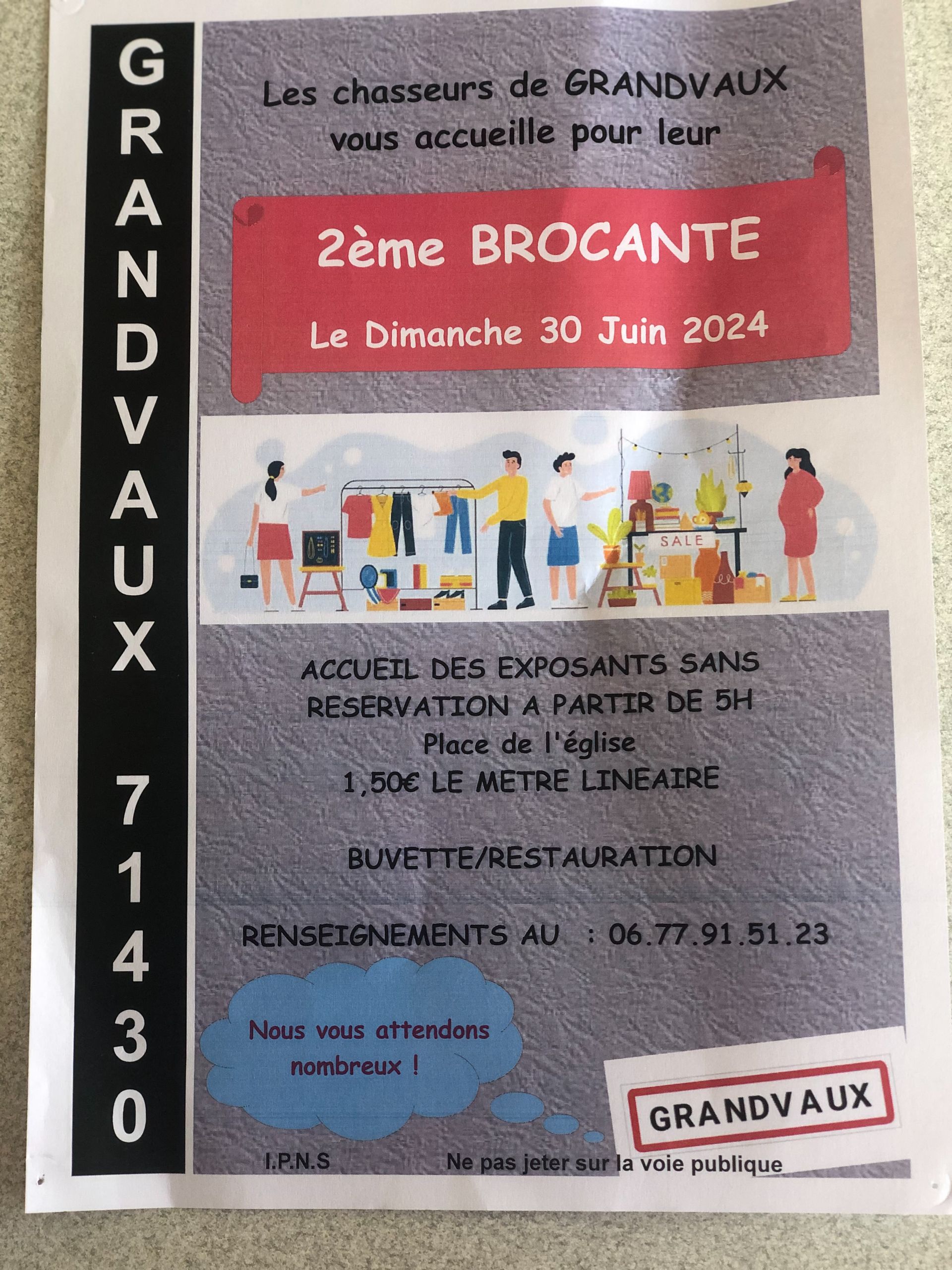 Les chasseurs de GRANDVAUX vous acceuillent pour leur 2ème brocante le Dimanche 30 Juin 2024. Accueil des exposants sans réservation à partir de 5H. Place de l'Eglise. 1,50€ le mètre linéaire. Buvette/restauration.