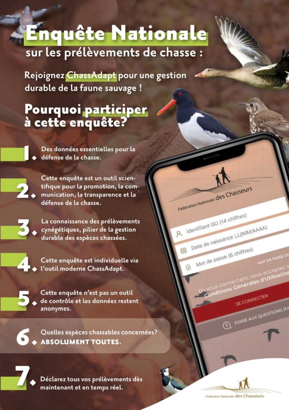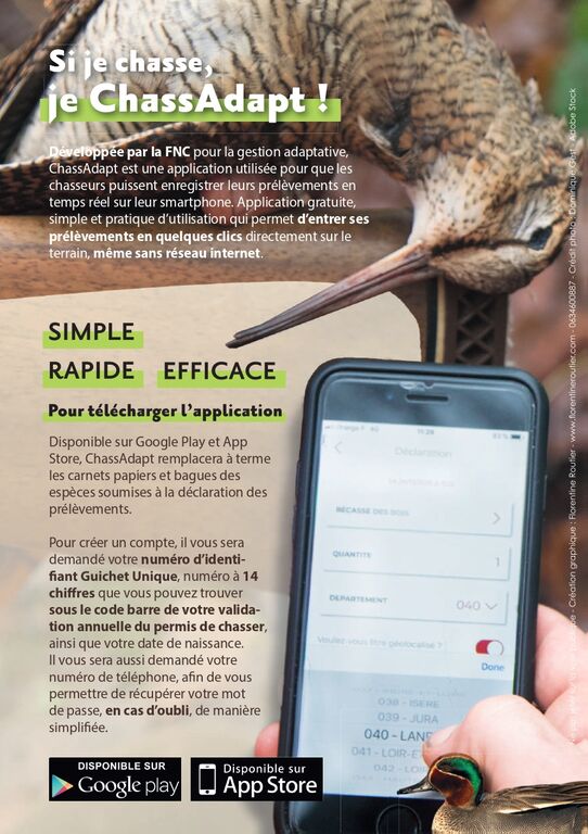 Développée en 2018 par la FNC dans le cadre de la gestion adaptative des espèces afin de gérer les quotas, l’application ChassAdapt, gratuite, simple et pratique d’utilisation, a été conçue pour vous permettre d’entrer vos prélèvements en quelques clics directement sur le terrain, même sans réseau Internet.