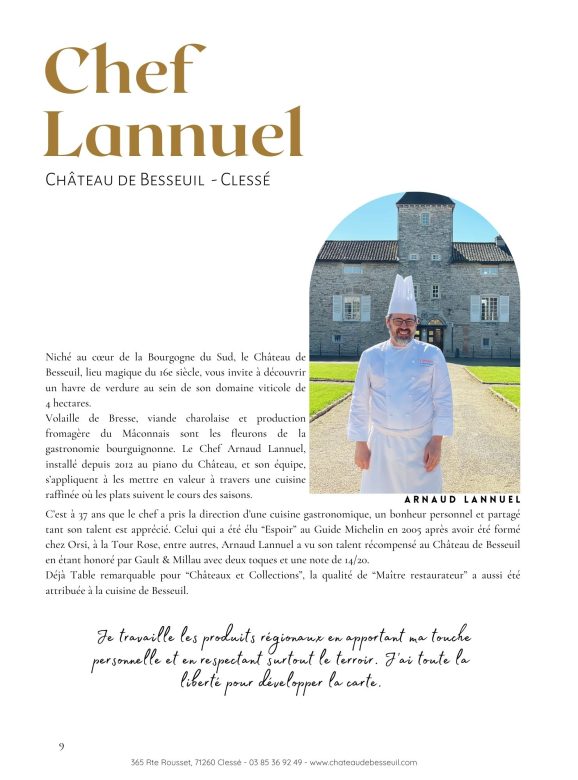 Volaille de Bresse, viande charolaise et production fromagère du Mâconnais sont les fleurons de la gastronomie bourguignonne. Le Chef Arnaud Lannuel, installé depuis 2012 au piano du Château, et son équipe, s’appliquent à les mettre en valeur à travers une cuisine raffinée où les plats suivent le cours des saisons.