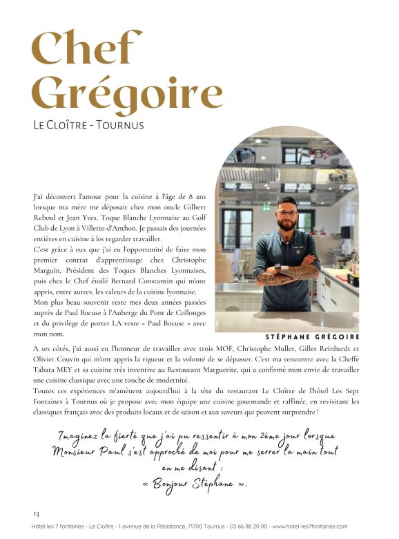 Lors de notre échange avec le Chef, il raconte être « Tombé dans la marmite » à l’âge de 8 ans, j’ai découvert ma vocation dans les cuisines de mon oncle, Toque Blanche Lyonnaise, au Golf Club de Lyon. Mon parcours m’a conduit auprès de Chefs emblématiques comme Christophe Marguin, Bernard Constantin ou encore Paul Bocuse. C’est en Bourgogne, aux Sept Fontaines à Tournus, que j’ai eu l’opportunité de prendre pour la première fois la tête d’une brigade. C’est une région qui m’a adopté et dans laquelle je m’épanouis aussi bien professionnellement que personnellement.