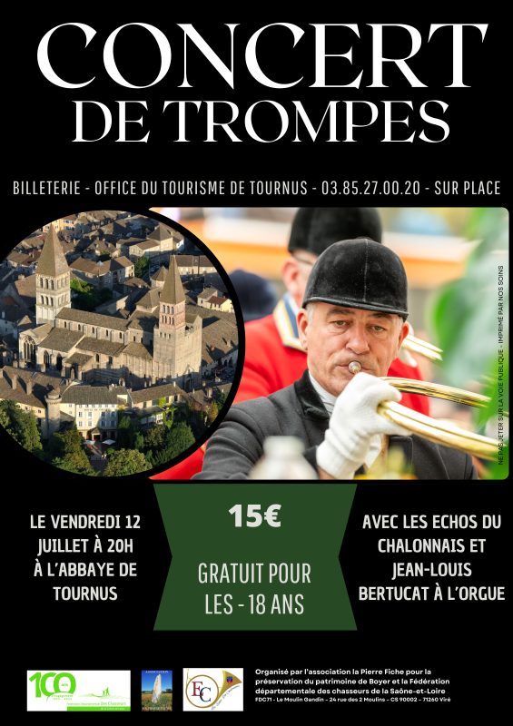 A cette occasion que nous sommes heureux de vous annoncer un concert de Trompes dans la ville de naissance de la Fédération : Tournus. L’occasion pour les sonneurs des Echos du Chalonnais, accompagnés à l’orgue par Jean-Louis Bertucat de faire sonner leur cors dans la magnifique abbaye Saint-Philibert.