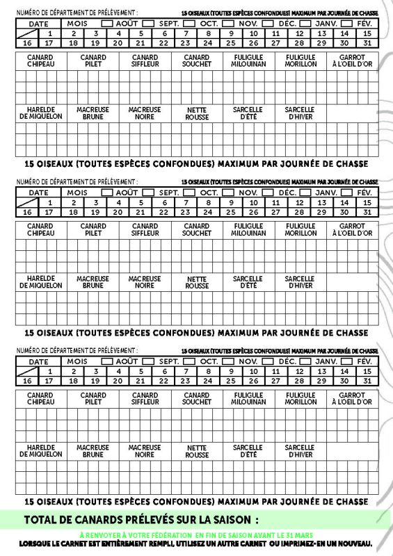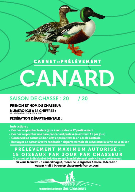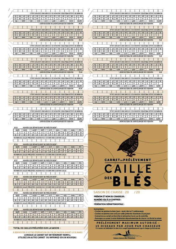 Vous trouverez également les carnets de prélèvement de la caille des blés et de la sauvagine.