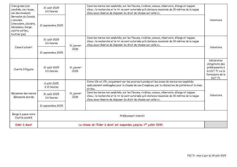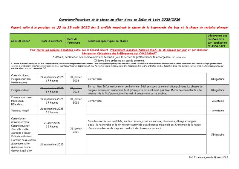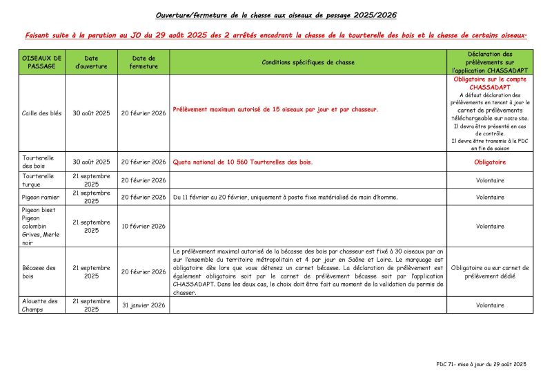 Afin de faciliter la compréhension des spécificités, nous vous avons préparé un tableau récapitulatif des dates, modalités de chasse et déclarations, faisant suite à la parution au JO du 29 août 2025 des 2 arrêtés encadrant la chasse de la tourterelle des bois et la chasse de certains oiseaux.