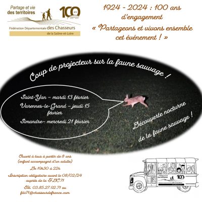 A l’occasion de son centenaire, la Fédération des chasseurs de la Saône-et-Loire (FDC 71) a décidé de célébrer cet anniversaire avec le plus grand nombre en organisant des événements pour ses adhérents, ses partenaires et pour le grand public tout au long de l’année 2024.