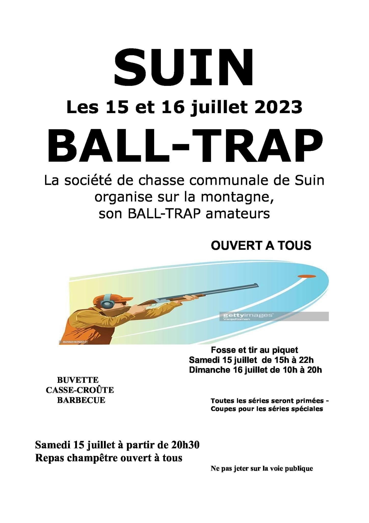 Comme chaque année la Société de chasse de Suin organise son BALL TRAP du 15 au 16 juillet. Depuis quelques années nous ne réalisons plus les tirs de nuits. Pour palier à ce manque nous bous préparons un repas champêtre le samedi soir.