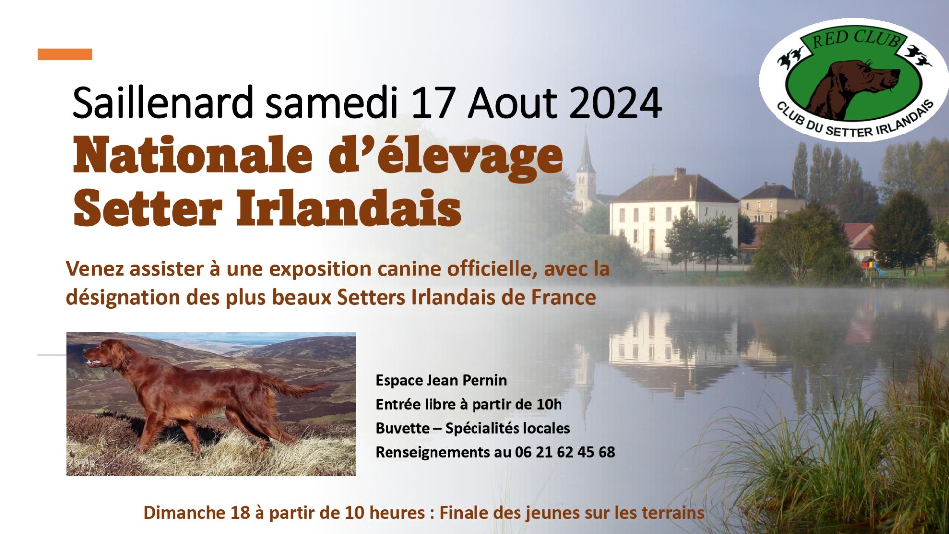 Les 17 et 18 août, exposition Nationale de Setters Irlandais. Les plus beaux chiens de France seront présents à Saillenard (10 mn de Louhans). Le 18 à partir de 10 h00, finale de travail des jeunes. Entrée gratuite