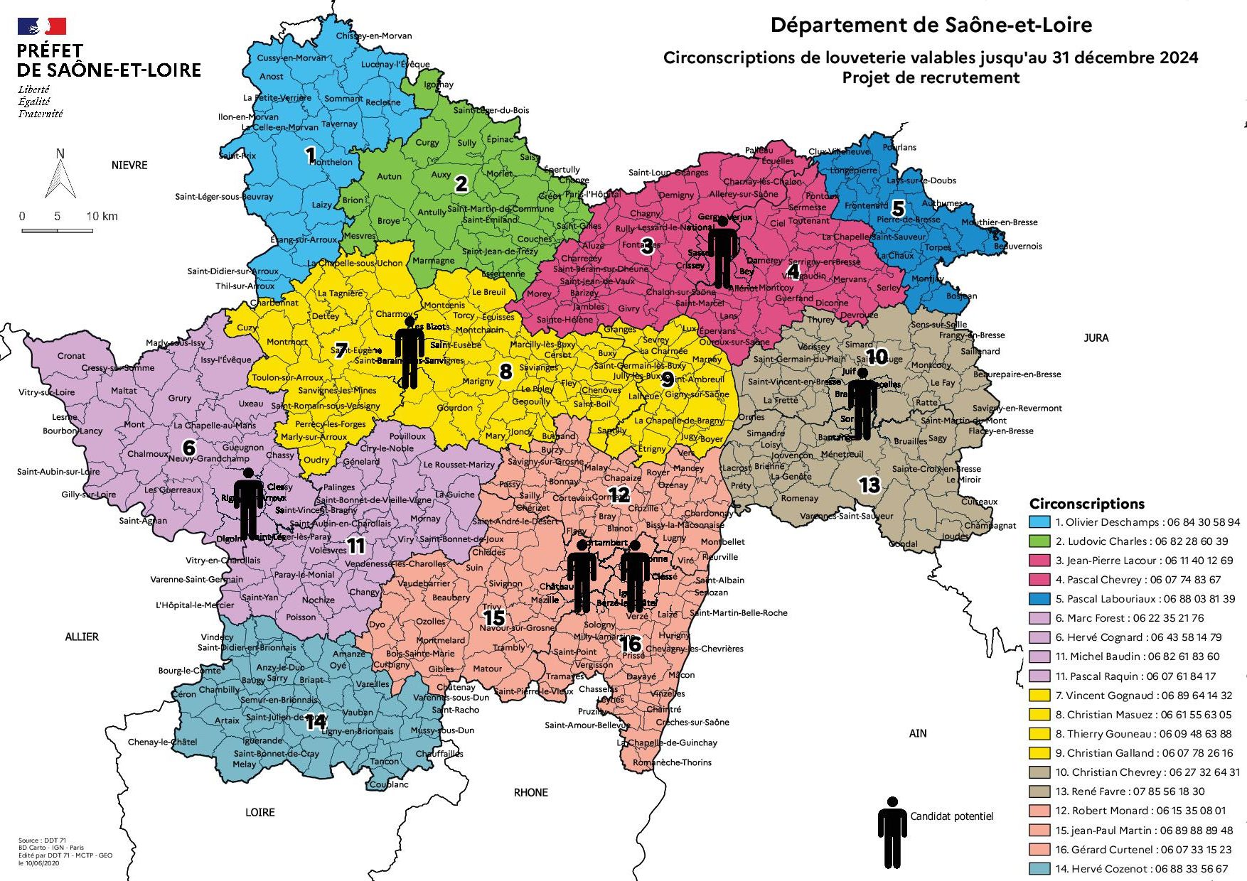 La DDT vient de lancer un appel à candidature pour le recrutement de 6 lieutenants de louveterie, qui interviendront en binôme ou en trinôme avec d’autres lieutenants de louveterie d’ores et déjà nommés, jusqu’au 31 décembre 2024 inclus, sur les circonscriptions n°3-4, 7-8-9, 6-11, 10-13 et 12-15-16 (voir carte ci-dessous).
