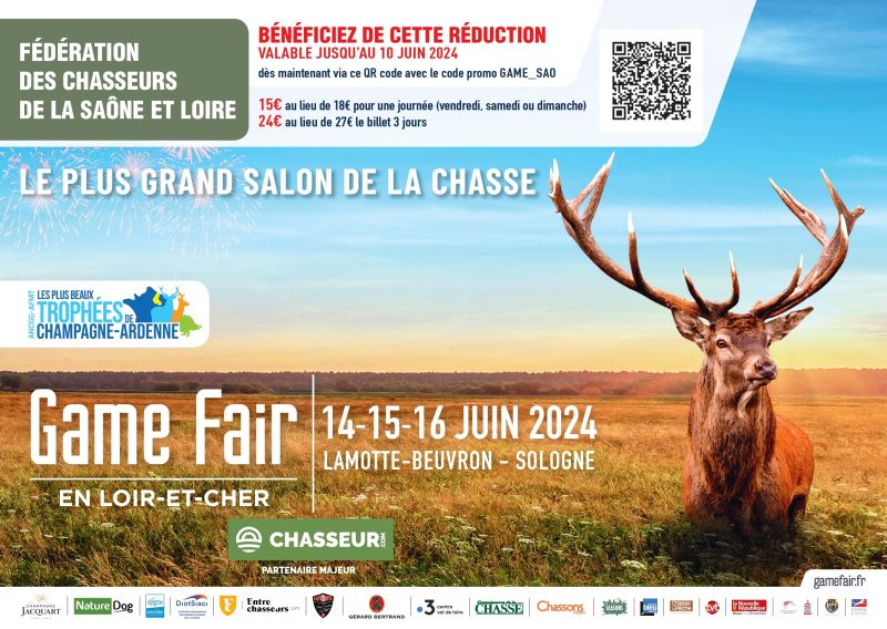 Les 14, 15 et 16 Juin prochains aura lieu le GAME FAIR à Lamotte Beuvron. Rendez-vous immanquable des chasseurs, nous avons le plaisir de vous faire bénéficier de 3€ de réduction sur vos billets d’entrée.